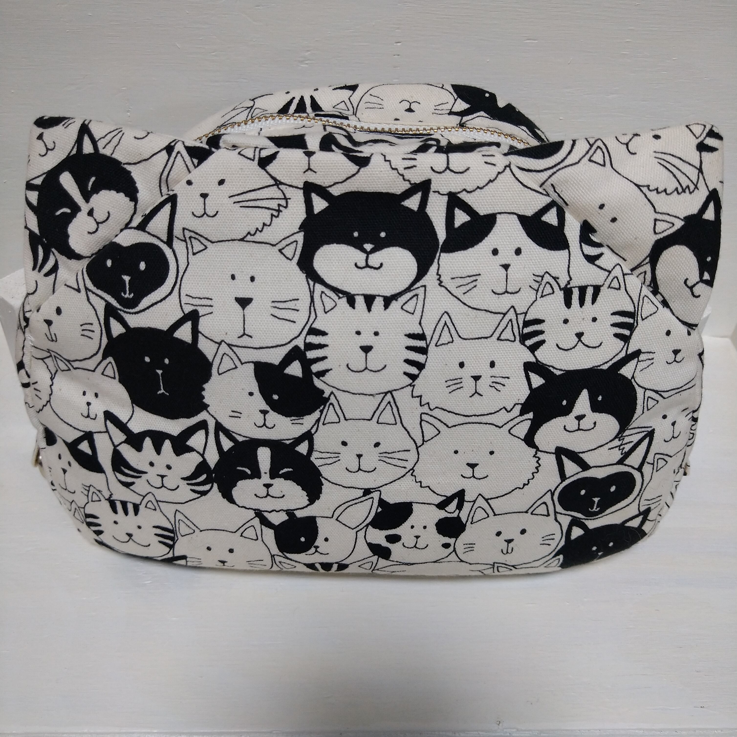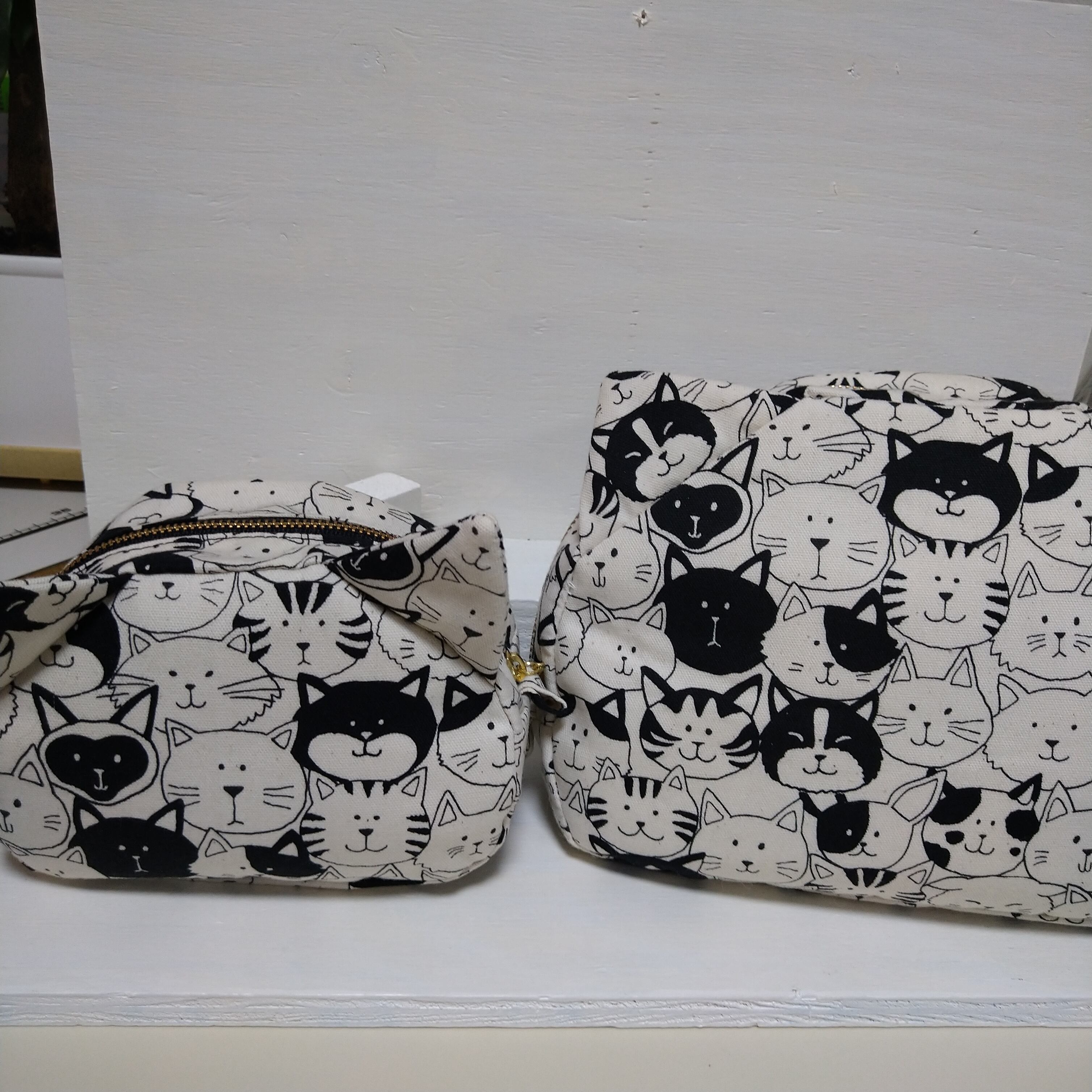 こちらは、ハンドメイドの猫顔ポーチセットです