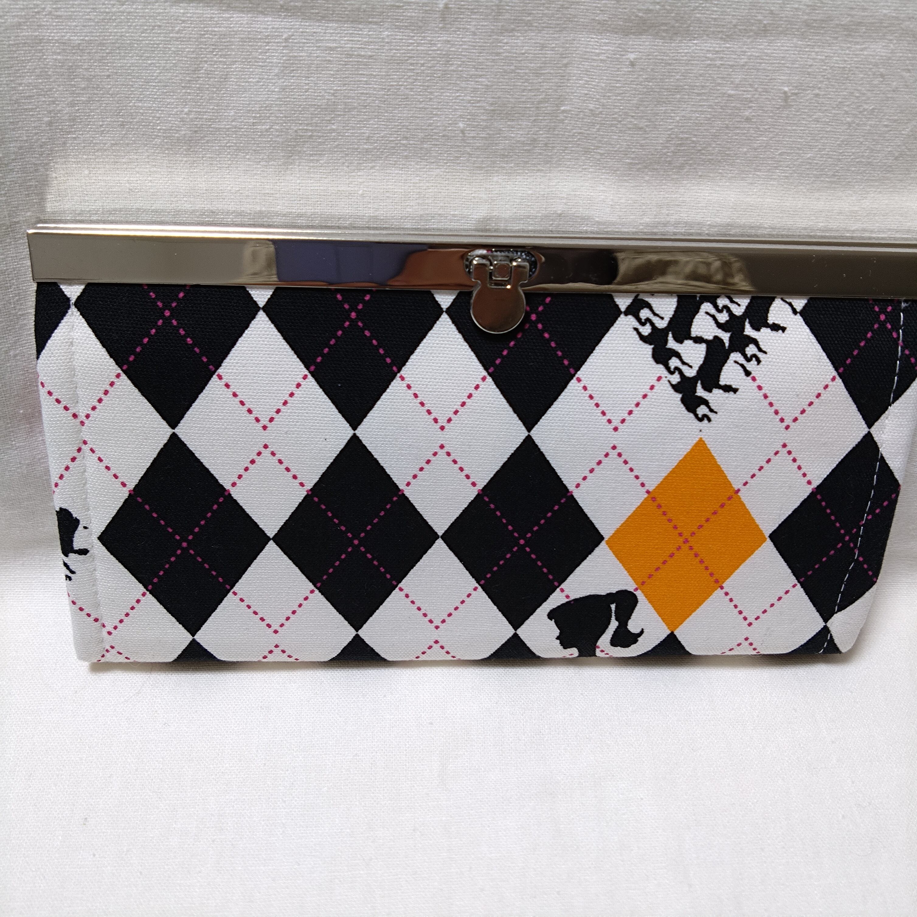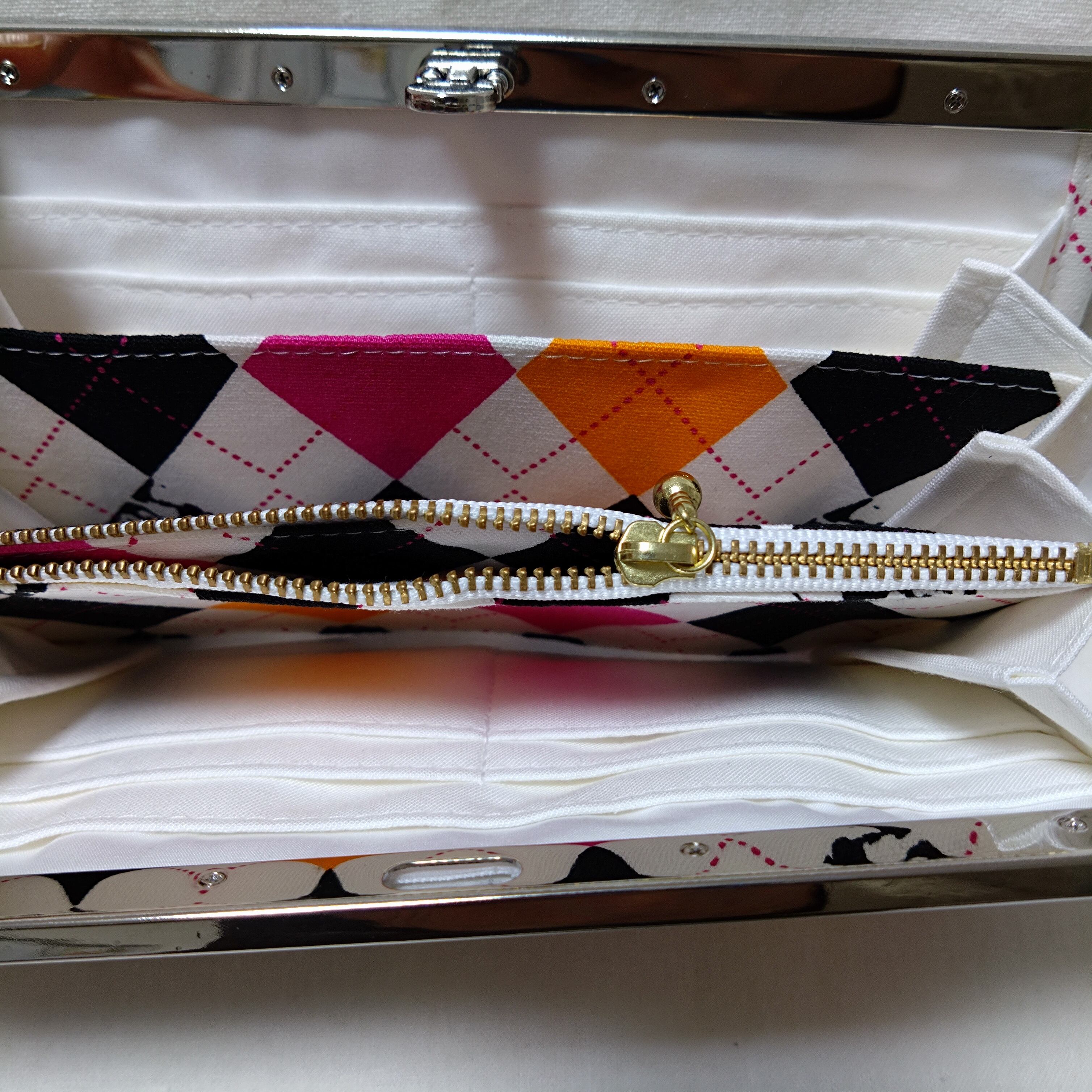 内布 白の無地、ファスナー口と仕切りは、表と同じアーガイル模様です